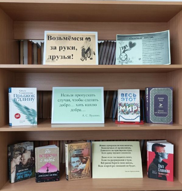 Книжная выставка оформлена к Декаде инвалидов. Здесь представлены книги о поддержке, дружбе и преодолении трудностей. Выставка помогает лучше понять мир людей с ограниченными возможностями и вдохновляет на взаимопомощь и уважение.