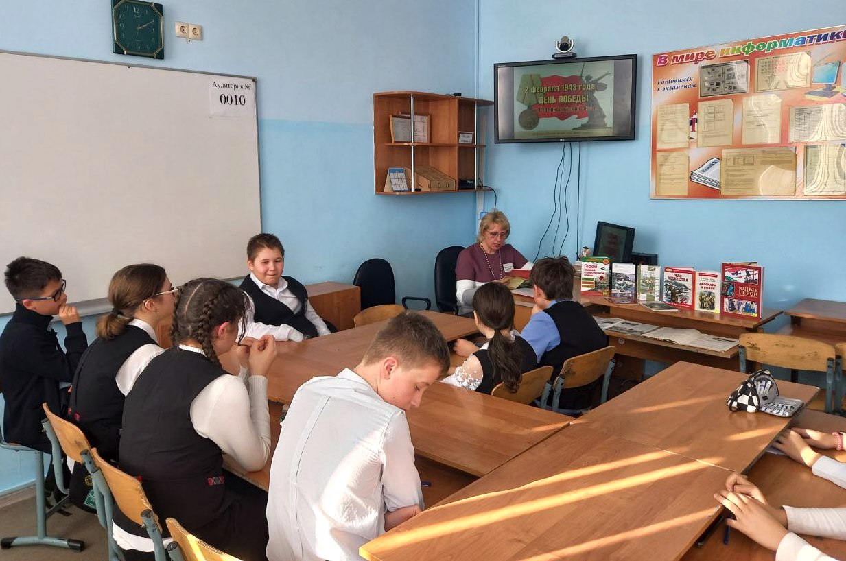 Учащимся школы № 12 на патриотическом часе «Здесь на главной высоте России» сотрудниками библиотеки было рассказано о тяжёлых месяцах Сталинградской битвы, о героях этих дней – детях, которые вместе со взрослыми сражались за Победу, были прочитаны рассказы Сергея Алексеева «Сталинградская оборона», «Мамаев курган», «Братцы, пустите!», «Знаменитый дом» и «Геннадий Сталинградович».