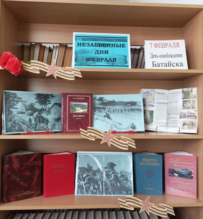 В феврале есть праздник, который особо дорог всем, кто родился, вырос и живёт в городе Батайске. Это День освобождения города от врагов. Ко Дню освобождения города Батайска в библиотеке № 1 им. В. Маяковского организована книжно-иллюстративная выставка-хроника «Незабвенные дни февраля», на которой представлены материалы о нелёгком периоде в истории нашего города и его доблестных защитниках.